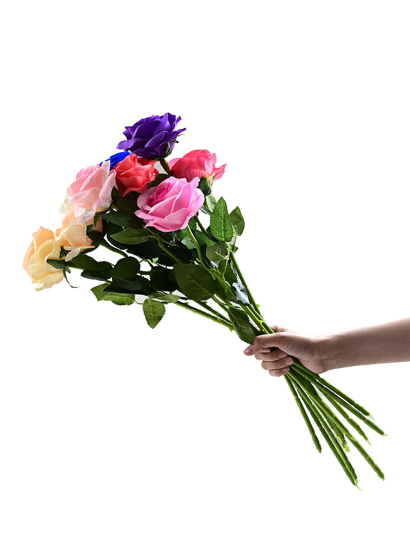 Materiale:I fiori falsi rosati sò un toccu veru.I petali di rosa sò fatti di tela di pongee, è e foglie sò fatti di poliester.Pongee pannu mostra caratteristiche di a natura, è piena di putenza vitale.Allora u pongee faux rose stem flower s'assumiglia vividly and realistic.Pongee pannu pò riparà u culore bè, ancu dopu à un annu di decoru.